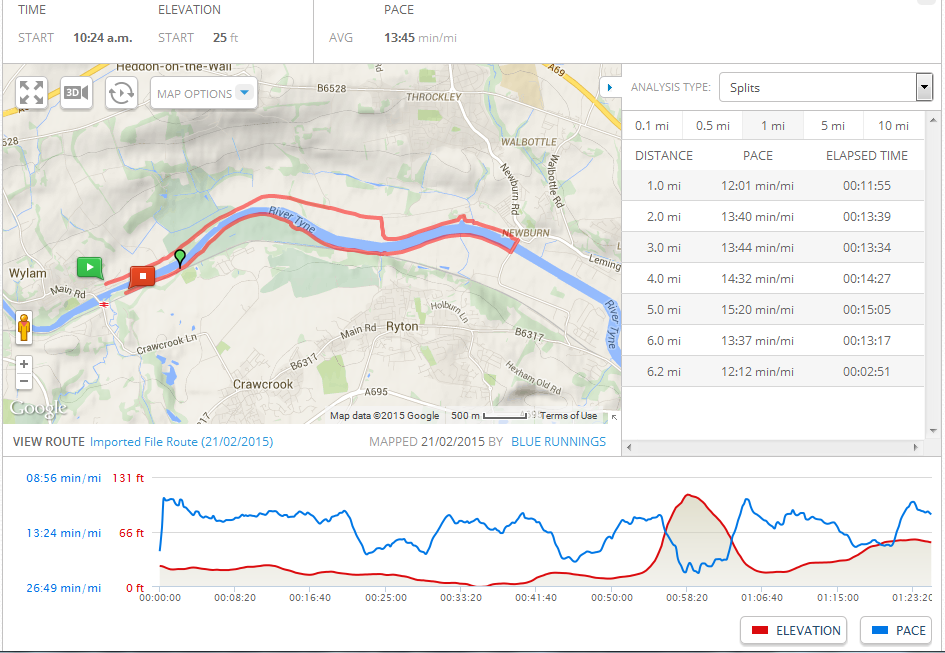J & I had mentioned earlier in the week about doing a run on Saturday morning ‘about 11ish’, but after a nightmare few days (and nights!) at work I phoned her at 08:50 this morning and told her I was going for a run, possibly a long one, and sooner than 11 as I desperately wanted to clear my head and not ruin my long weekend off carrying a load of work-related agitation around. So, we both got our running gear on and went down to the river at Wylam to see how far along the route to Newburn and back we could get – it’s approximately 5k each way from bridge to bridge in a loop.