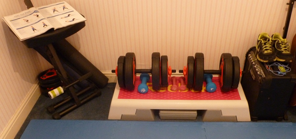 The guitar chair is now my magazine stand, and I dragged my step out the attic for calf exercises, and to use as a ‘box’ when it’s at full height for push-ups etc. (One day, one day I will be able to do a set of full press-up!!!) The new big dumbbells I am hoping to upgrade to using soon – but not in the way P’s currently got them set up! The small weights stacked under the guitar chair are 1.25kg each – so by putting one on each side of the bar, I’ll have two 2.5kg dumbbells to try as an upgrade to the current 2kg ones I’m using, without having to buy another set of hand weights! The weights currently on the bars are 2.5kgs (and I could also use these as they have handles in them) and 5kgs – so if I don’t want to buy any more hand weights, I’d have to jump straight from 2.5kg to 4kg – which I’m unlikely to do – but we’ll deal with that when the time comes! For now, I have more than enough to be getting on with!
