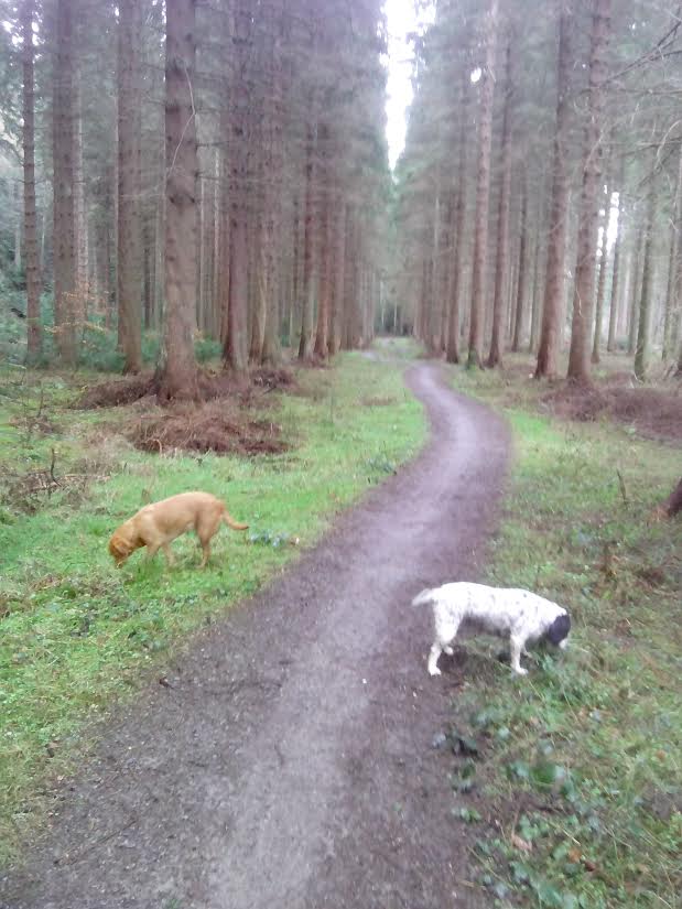Hamsterley is a Forestry Commission maintained, mainly coniferous woodland – certainly the bits I saw were. The wider planted sections had a covering of moss and other undergrowth plants which made the area very pretty and lush, but the denser areas which were used more for ‘farming’ trees were too tightly packed to move through and had that usual very very noise-stifling effect of pines. Fortunately we weren’t running through the latter, only past them! J took the dogs for a walk while I was tracking about the place, they loved it and had to be chucked in the river before getting back in the car – they were absolutely black with mud!