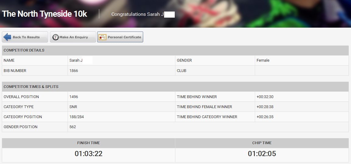 I really enjoyed this one, it was well organised – the race numbers were posted out quite a way in advance, there were several marshalls stretched along the route so you were never far to the next one, the shuttle buses ran smoothly, starting was prompt, road closures kept to a minimum, there was a well-stocked water station around the halfway mark and at the end, and the ambience along the waterfront particularly along Whitley Bay with the spectators was great. Definitely one for next year’s running calendar!