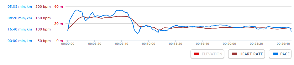 I’m interested to see what my heart rate goes up to when I’m running nearer the 6min/km mark for any duration – we were at 07:12 for the jogging stretch at the start where my pulse was approx. 150bpm. This puts me at the top end of the ‘Tempo’ pace, or the bottom of the ‘Race Pace’ categories for my default settings. I don’t feel out of breath particularly at the faster pace, but I wonder how fast my heart is pumping to get the oxygen to my muscles to bring this about compared with at the slower pace. One way to find out I guess!