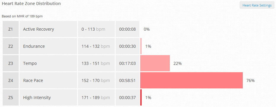 I had the heart monitor on again for this one – the longest trip I’ve tried it out on so far, and I’m not sure if I’ll bother with it again. I don’t know if it was the wet or just the monitor with the longer distance, but there were times when it was getting on my nerves a bit, and trying to re-adjust things under wet clothes is not nice. Most of the run however I did forget I was wearing it. I may try wearing it lower and see if it works around my waist or something. I don’t know if it will or not – one way to find out! Interestingly, my heartbeat was rock steady for most of the route – of the 1hr 17mins we were running for, a 1hr stretch of that had my heartbeat at 157bpm – just into the ‘race pace’ category. I don’t know if it’s normally like that and I get into a good balance when I’m running, or if it was just running at J’s militantly steady pace. The second table shows the amount of time I spent at each heartrate.
