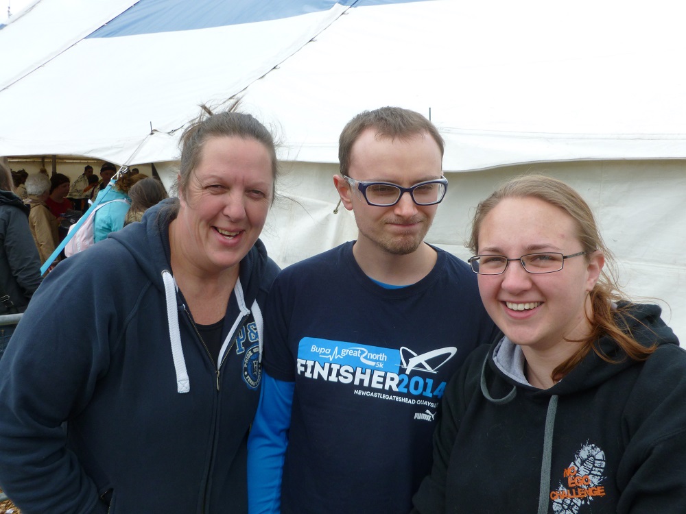 We trooped back to the car – and got changed as quickly as possible in a field full of cowpat when hiding under towels and ponchos and trying to remove soaking wet clothing, which is never a nice task even if you’ve got room to do so at your leisure and it’s not blowing a gale outside! As such, our final event picture was taken with us all back in the car with fresh clothes on – but before we stole all J’s face wipes to clean up properly with – it was too cold, wet and windy to be standing around outside for it!