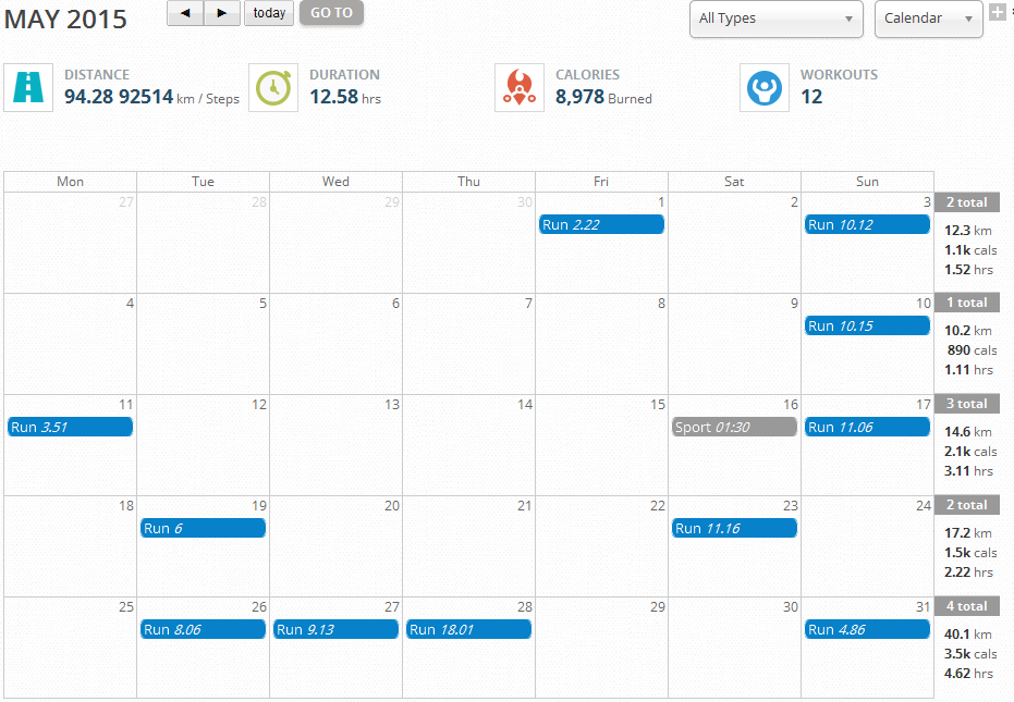 The thing I am quite pleased with for May – glossing over that big blank white space in the middle of the first three weeks – is my running for the last week, where I did 40km in a week, and 3 runs over 8km in 3 consecutive days, both of which have to be new personal records for me – though I fear my legs may never forgive me! My duration graph is also starting to take a nice little rise back up over the last 2 weeks too, after its nosedive as soon as we got into May.