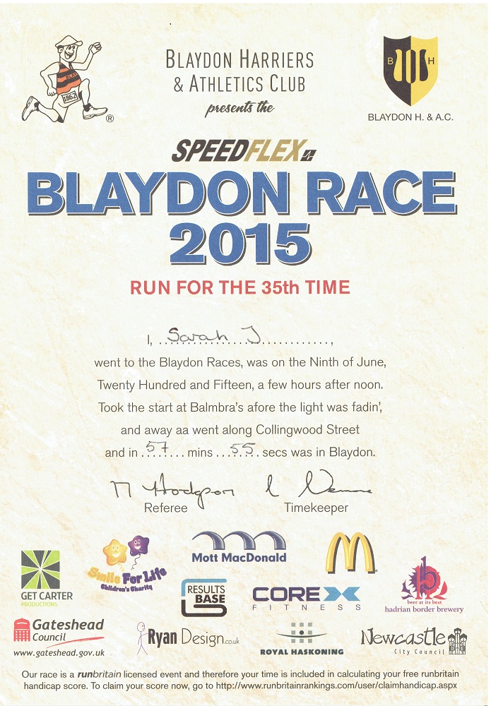 When I got home and investigated the bag contents further, I discovered that not only did the paperwork stuff contain a ‘programme’ from the race including all the competitors names and bib numbers, there was also a ‘Blaydon Race’ certificate to fill your name and time in on, which I thought was a nice touch, this now lives in my increasingly full race number folder with my bib from the race 🙂
