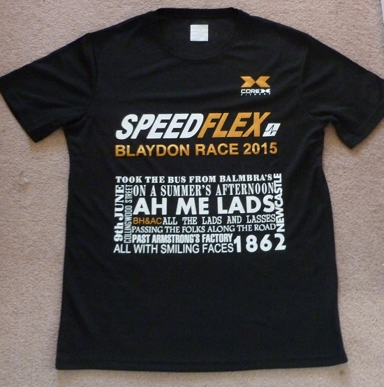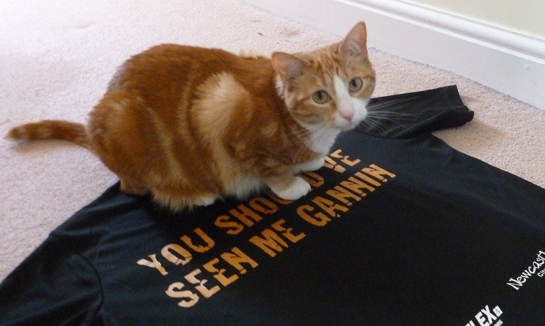 We also got the infamous Blaydon Race t-shirt, I’ve seen several people running in the one from the year before last (apparently last year’s was purple and for some reason not very popular? I don’t recall seeing it anyway), and this year’s is in a similar vein with a different sponsor, and features several quotes from ‘The Blaydon Races’ song. It’s a nice light-weight fabric for the summer 🙂