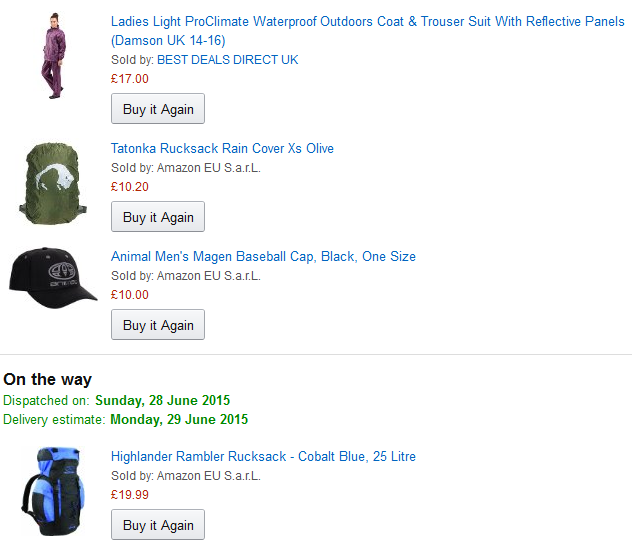 I thought I was off to a good start – found a bag and the only things it looked like I was missing was a waterproof rucksack cover and a sunhat – I have a visor but I wanted something that would cover my whole head if I’m potentially out in the sun all day. I added to this list some new light weight and compact waterproofs as my trousers are pretty hardcore heavy duty ones, and I either have a bulky walking coat – no for travelling with – or my running one, which is fine for showers but I’m dubious as to how it will stand up against a downpour if we hit one. Pete then pointed out that he thought the bag I’d dug out was broken somehow. Had another look, couldn’t see anything, looked again – one of the shoulder straps was knotted as the adjustor and pivot point had snapped – not the best if you’re carrying it all weekend. I have no idea why we were storing a broken bag, I don’t think we’re likely to be that desperate that we’re fishing for broken bags. So, new bag got added to the list.