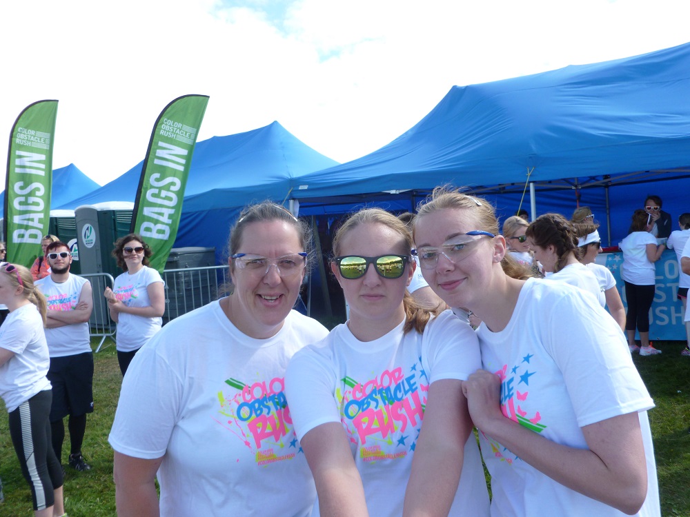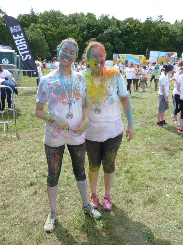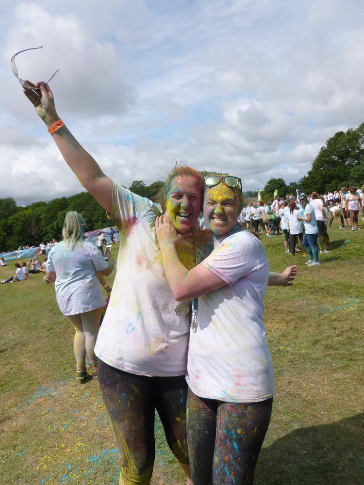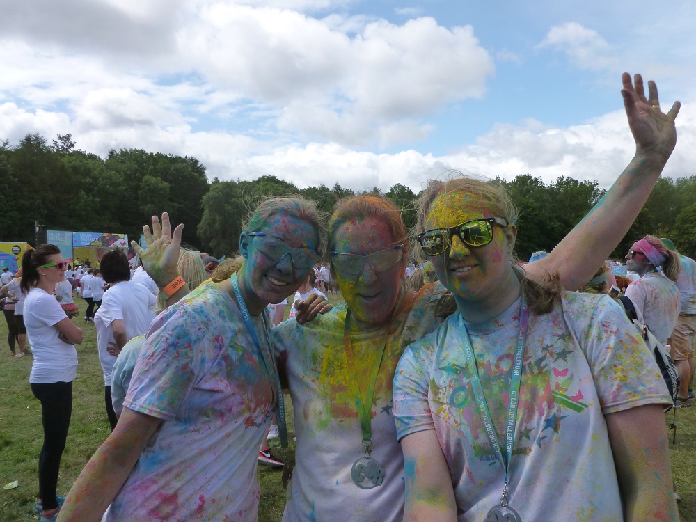 All in all it was a fun day out; we all got a t-shirt and a medal included, J and Sarah both got the ‘early bird’ packs including an event headband, a pair of sunglasses and extra packets of dye to throw at people π We dumped them both all over J at the end in revenge for the handfuls at the colour marquees.
