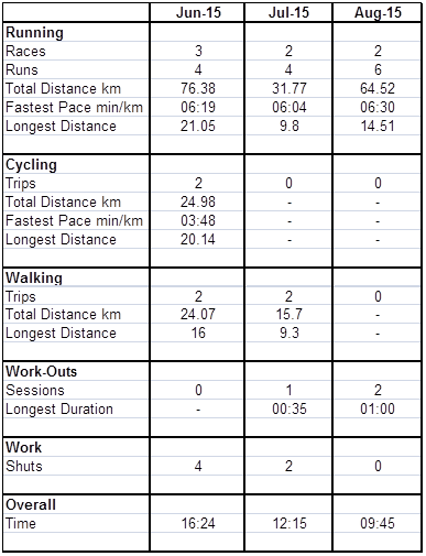 My exercising has seen a bit of a pick up after a slump in July, you can see where my holidays and family time were! Don’t worry, I wasn’t slacking, there was much walking about and stairs if nothing else!